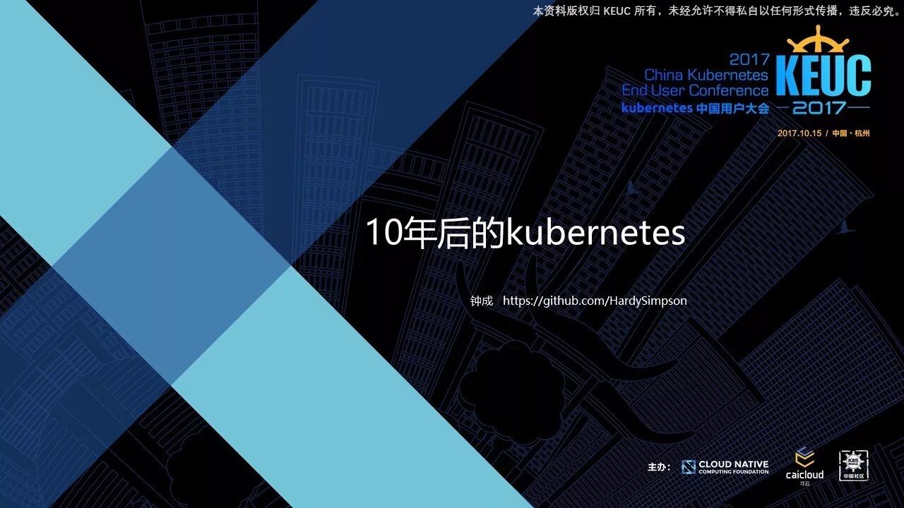 大家好!非常感谢才云给我提供机会,来到技术论坛和大家分享一下十年后的 Kubernetes。大家听到现在应该比较累了,我想这应该是一个比较轻松的话题。我今天想谈的其实是一个比较偏轻松的话题,也是一个比较长远的话题。再过十年之后,Kubernetes 这个项目或者这个生态会往哪个方向发展。
