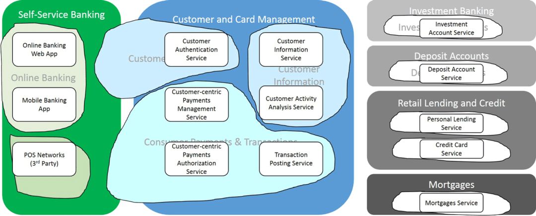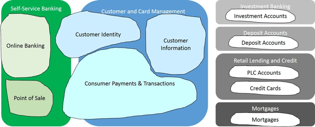 继DDD方法松散之后,我们可以首先将零售银行业务领域划分为子域。作为一个起点,并遵循康威法则的必然性,可以从组成零售银行的组织单位开始,并与以客户为中心的支付解决方案相关。这些是:
