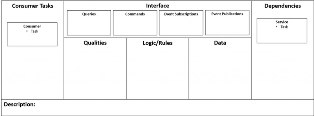 你可以先在底部框中填写服务的自由格式“说明”。从这里开始,你应该完成“消费者任务”框,记录服务消费者需要执行的任务。列举服务的消费者以及他们需要执行的任务有助于明确服务的目的,并提供设计界面所需的材料输入。这些信息可以帮助填写“界面”框。在这里,消费者任务可以细分为与服务接口的特定交互。根据模式(查询,命令,事件)对交互进行分类,将有助于形成底层服务实现,并最终推动API的设计。