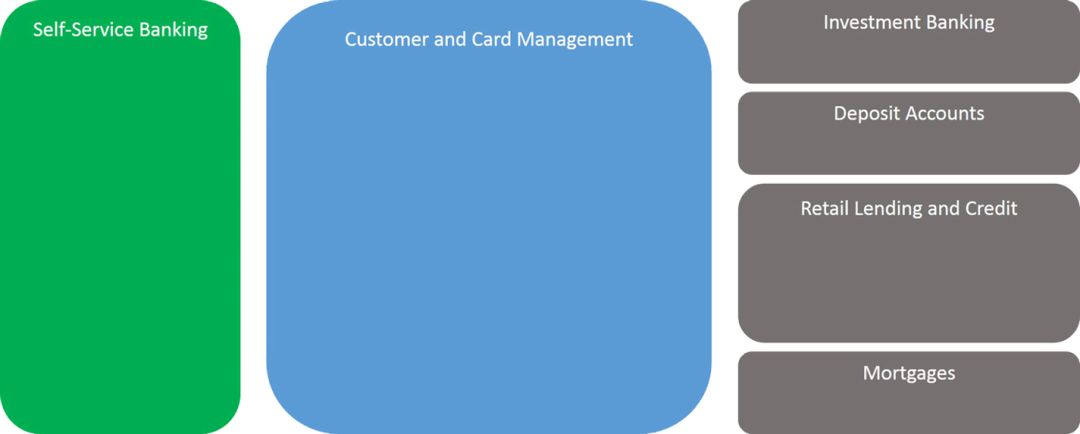 这给了我们一个考虑如何分类创建以客户为中心的支付解决方案服务的起点。自助银行和客户与卡片管理子域名突出显示,因为它们已被确定为解决方案的关键子域名。使用DDD的“语言边界”概念,显然有一些有界上下文出现在子域中。
