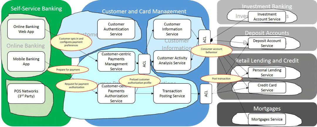 在确定了有界上下文之后,现在可以考虑顾客将在其中使用哪些服务。如前所述,网上银行有两种服务消费者:网上银行web App和手机银行App。新的支付解决方案也将通过销售点的POS网络收到的消息请求所消耗。