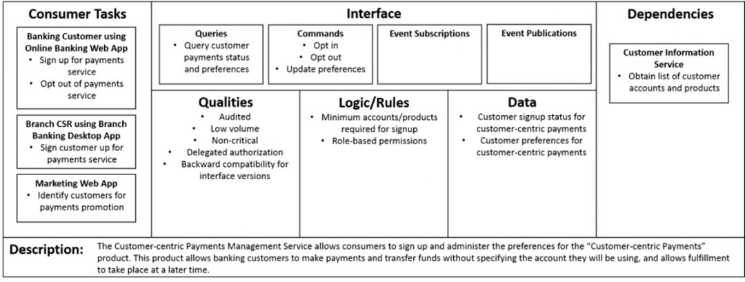 来看几个示例画布。首先是以客户为中心的支付管理服务画布: