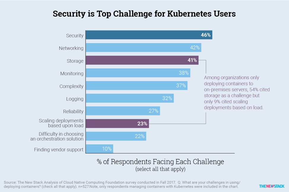 研究结果表明,在对Kubernetes的普遍批评中,复杂性仅仅是排在第五位的挑战。领先的是与基础设施相关的挑战。在Kubernetes用户中,有46%的人提到了安全问题,网络和存储排在第二和第三位。